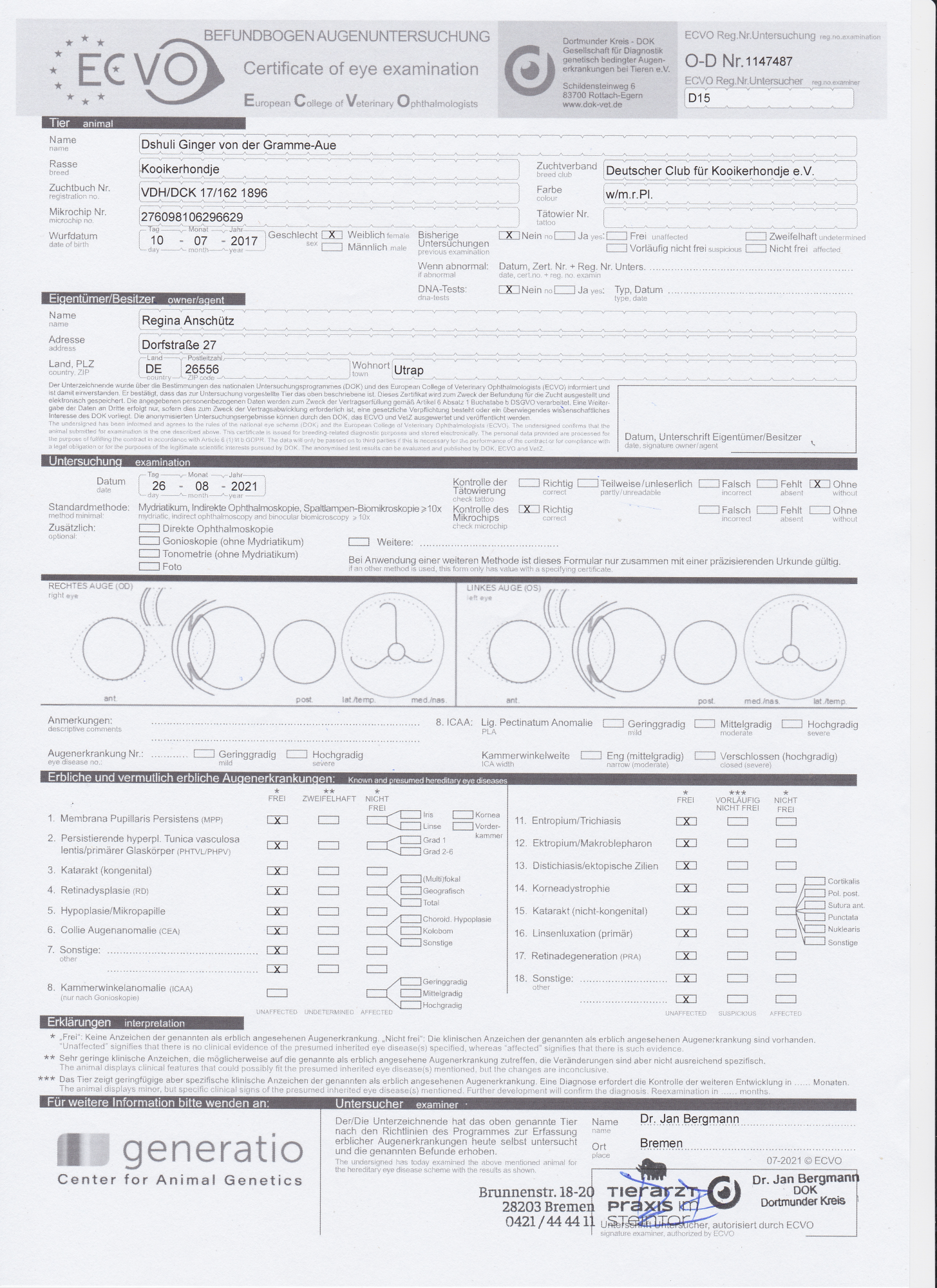 Gesundheitsuntersuchungen Nayeli Ahnentafel DCK Zuchthündin Gesundheitsuntersuchungen Zuchtzulassung Ausstellungsergebnisse
